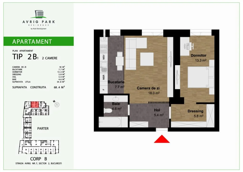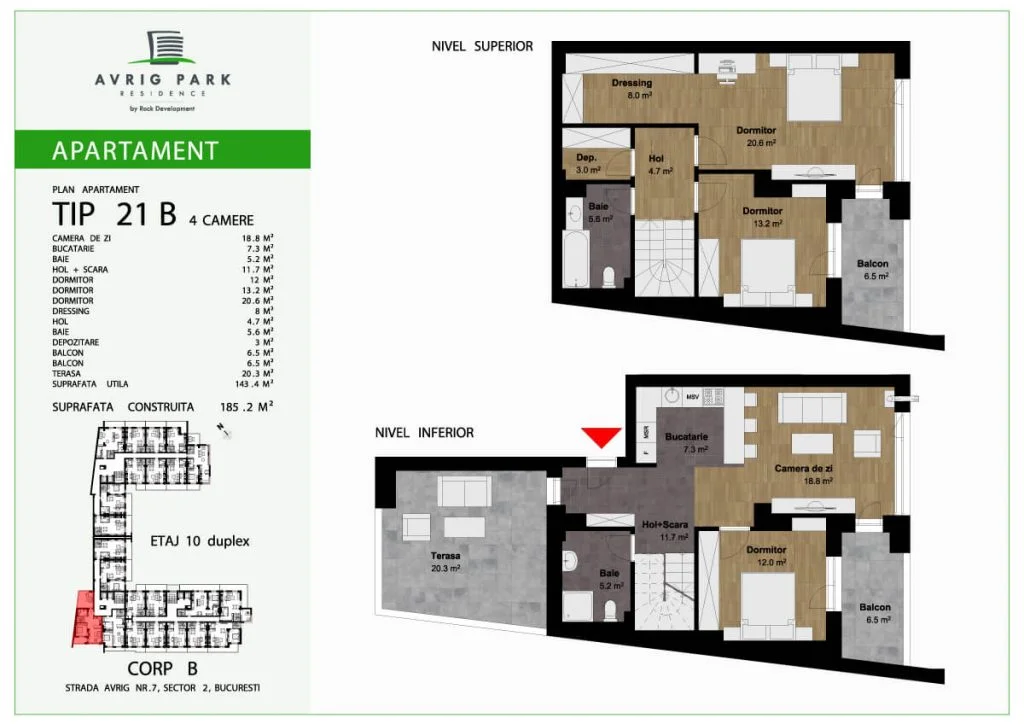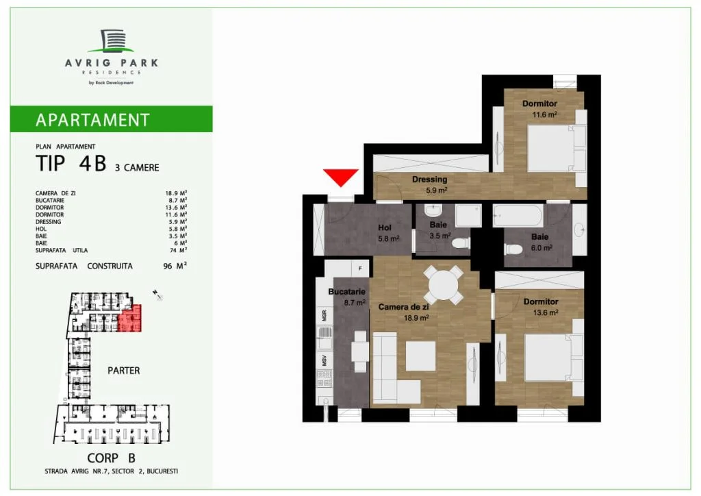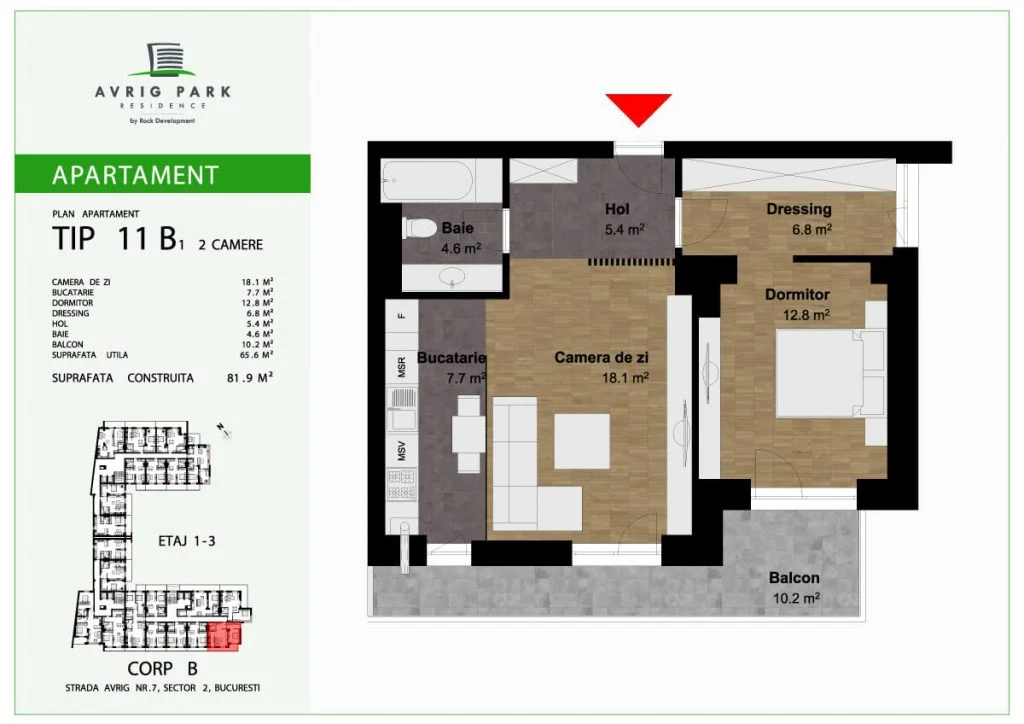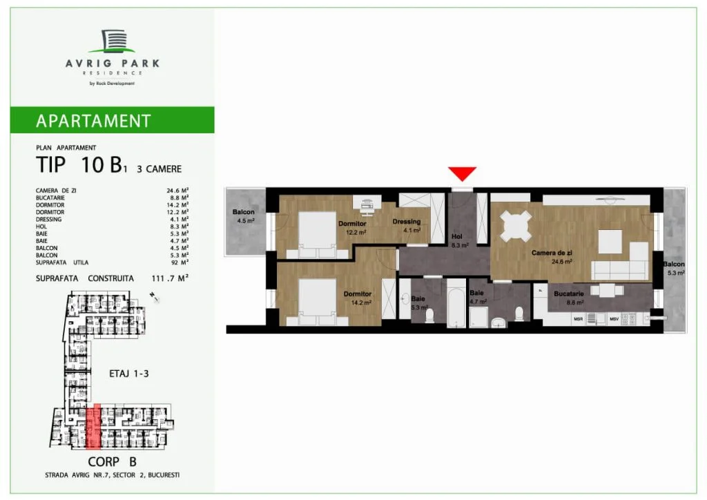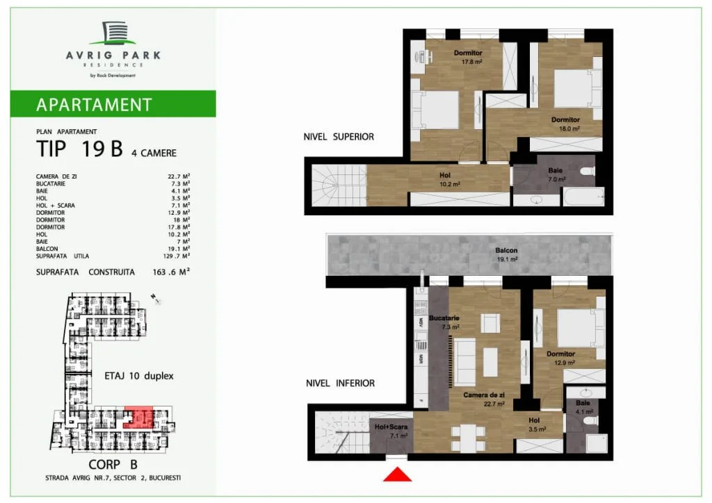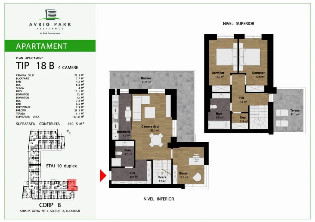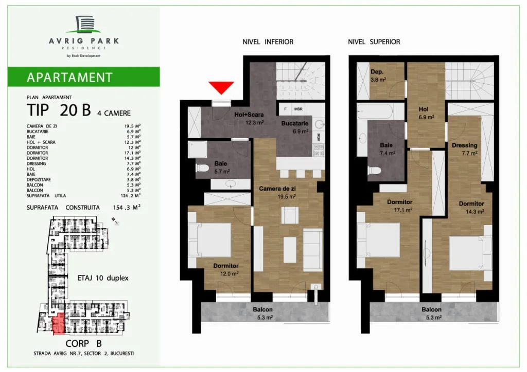 Avrig Park Residence este format din două clădiri independente, Corpul A cu un regim de înălțime 5S+P+10 duplexuri, 134 apartamente și 183 locuri de parcare, recepționată și livrată la final de 2023 și Corpul B cu un regim de înălțime 3S+P+10duplex, 222 apartamente și 222 de locuri de parcare – apartamente de tip studio, studio plus, apartamente cu 2 sau 3 camere, dar și duplexuri cu 2, 3 sau 4 camere, aflate doar la ultimele două niveluri ale complexului.