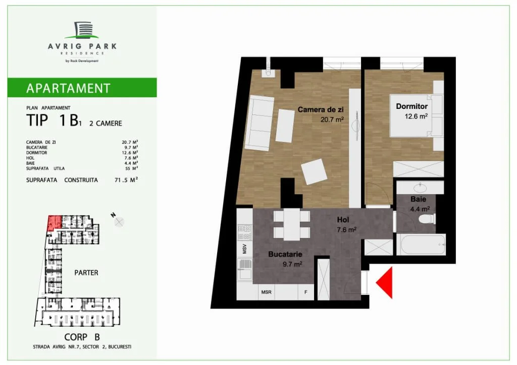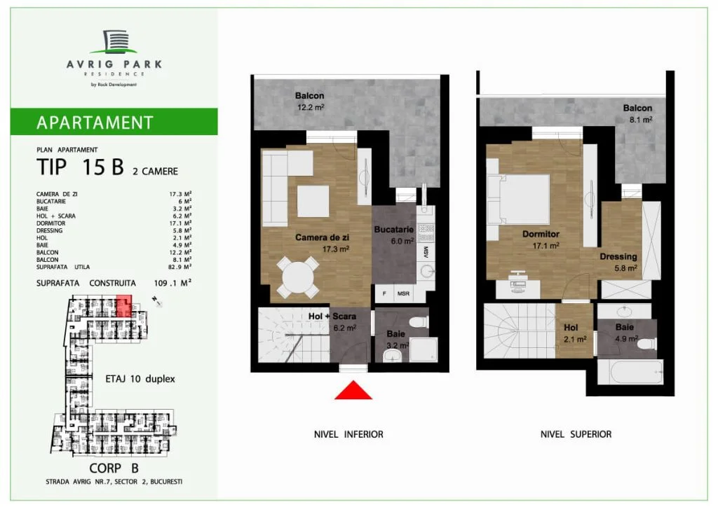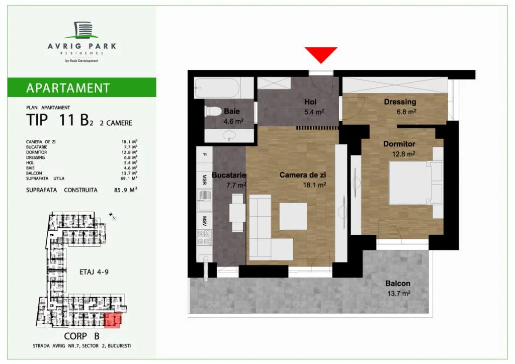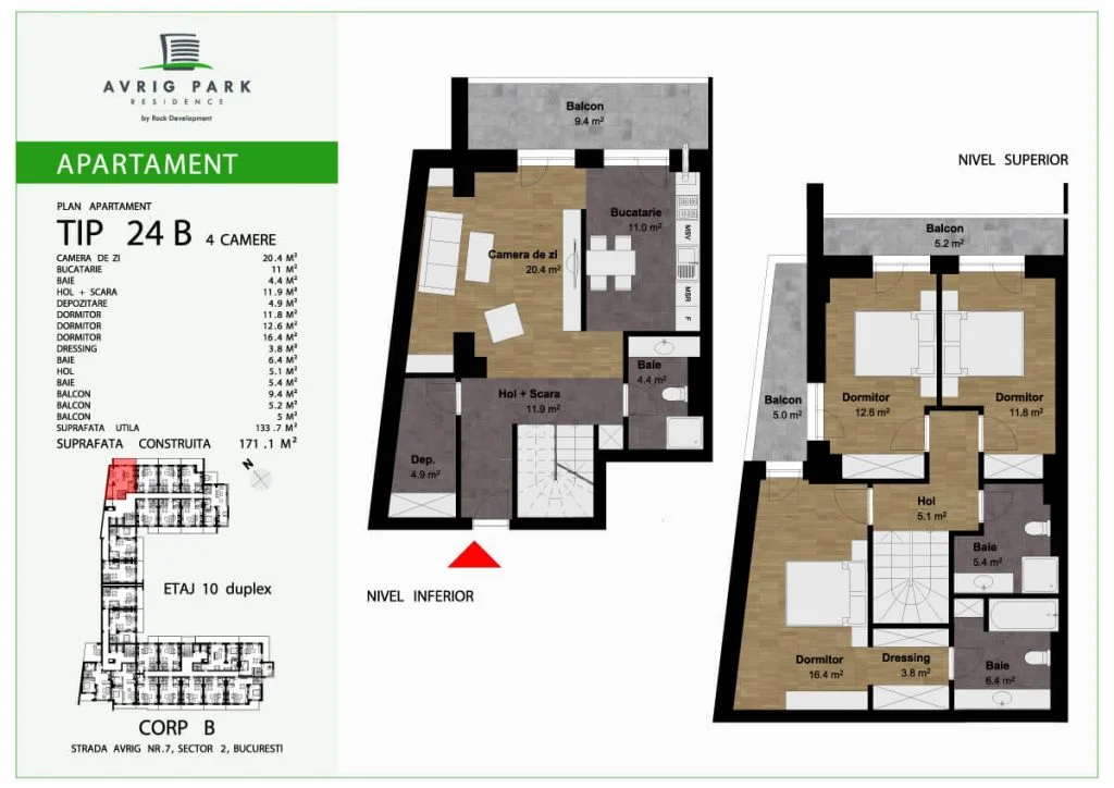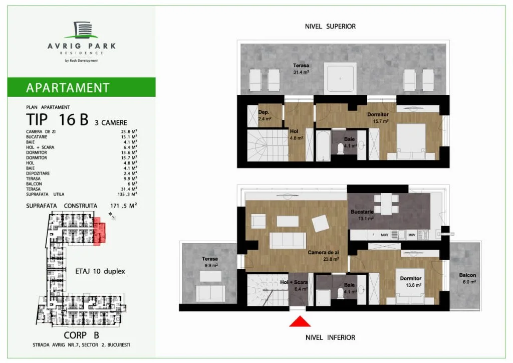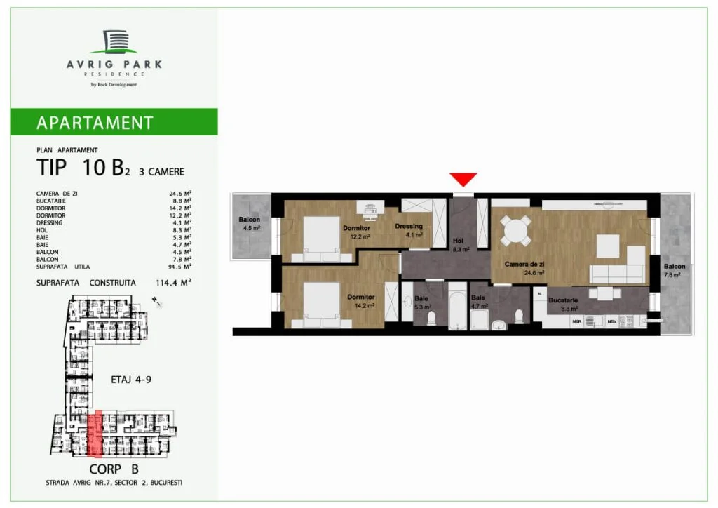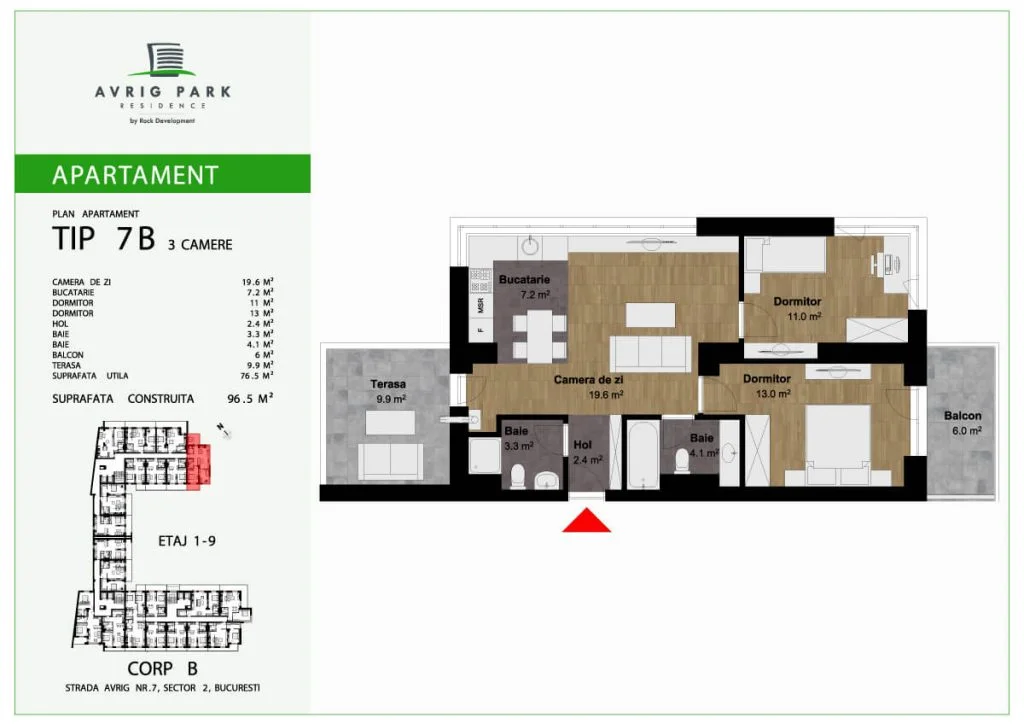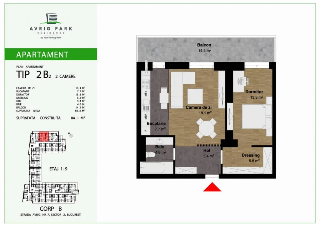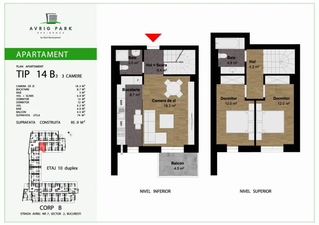 Avrig Park Residence este format din două clădiri independente, Corpul A cu un regim de înălțime 5S+P+10 duplexuri, 134 apartamente și 183 locuri de parcare, recepționată și livrată la final de 2023 și Corpul B cu un regim de înălțime 3S+P+10duplex, 222 apartamente și 222 de locuri de parcare – apartamente de tip studio, studio plus, apartamente cu 2 sau 3 camere, dar și duplexuri cu 2, 3 sau 4 camere, aflate doar la ultimele două niveluri ale complexului.