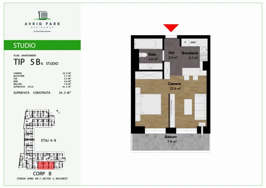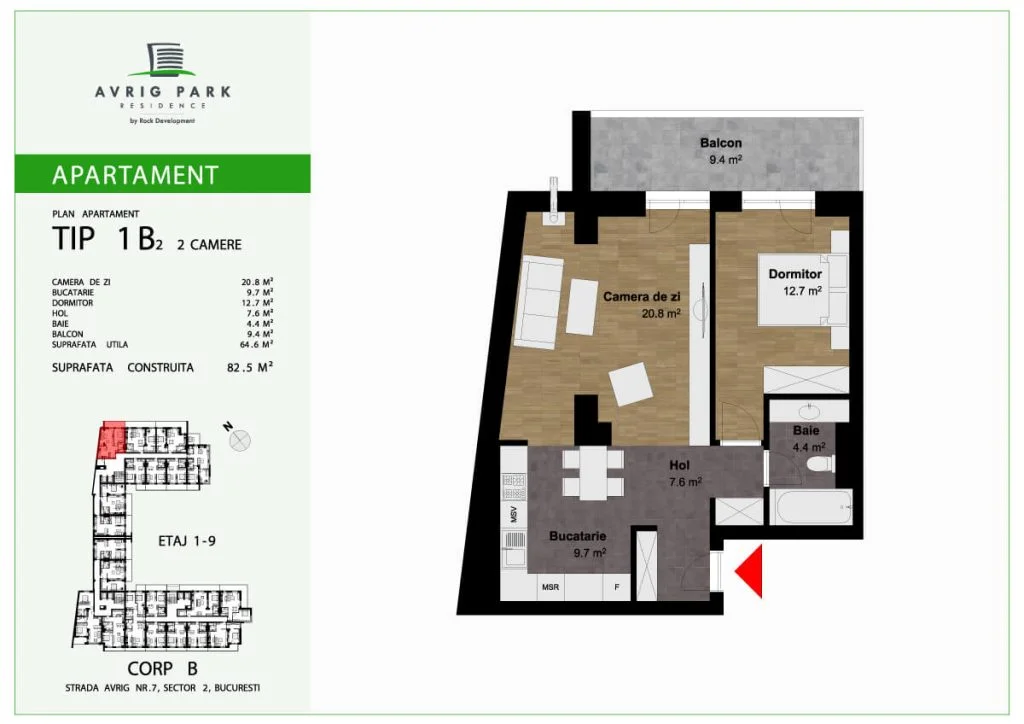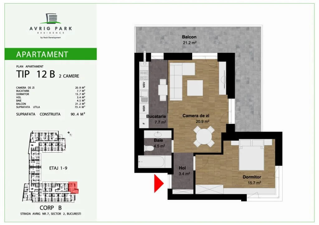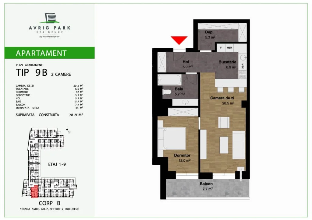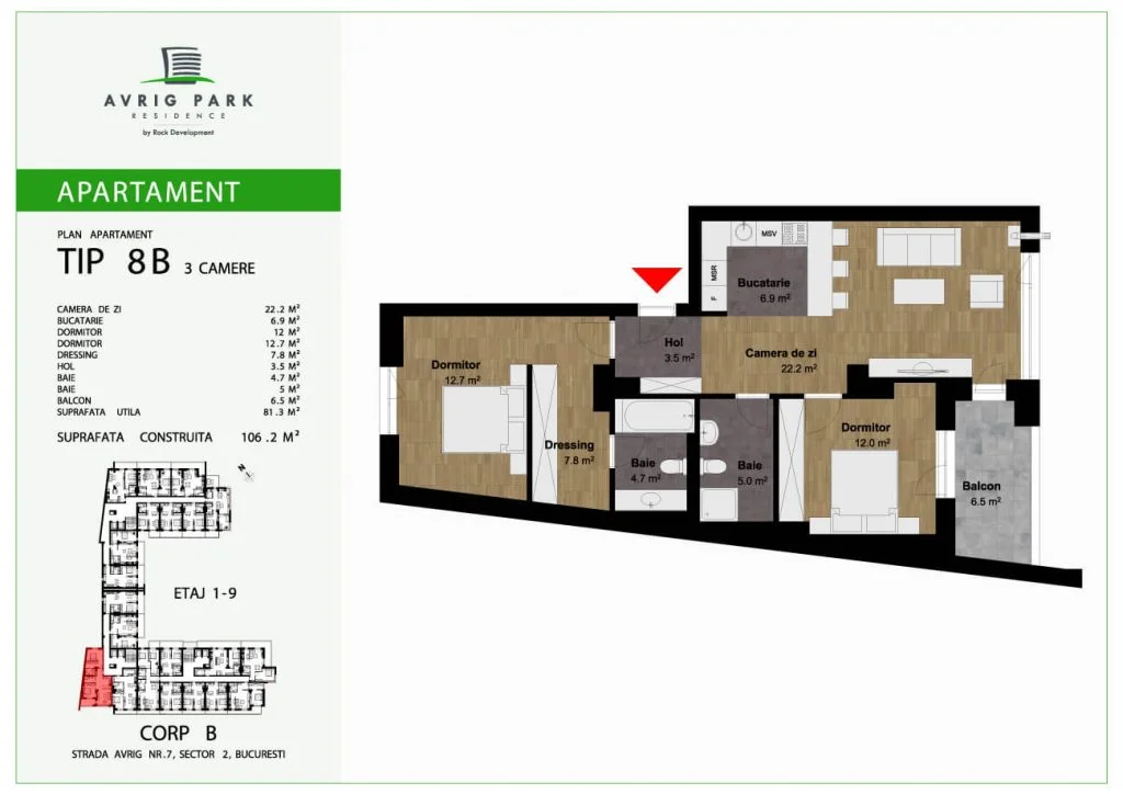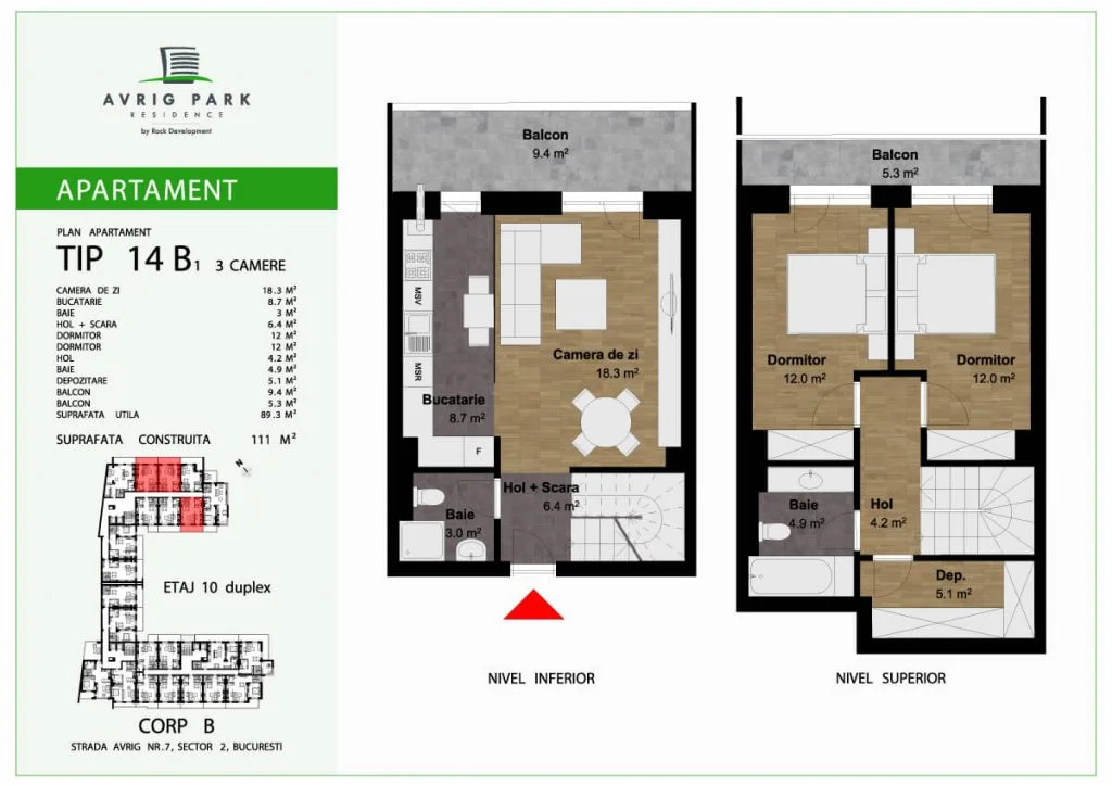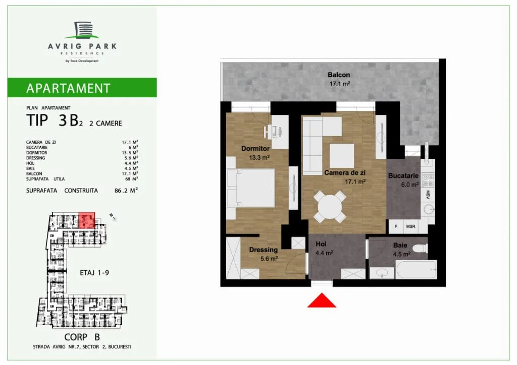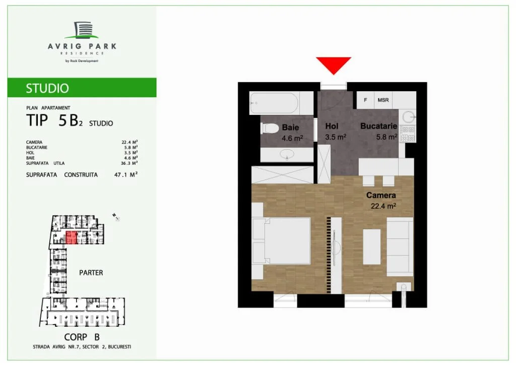 Avrig Park Residence este format din două clădiri independente, Corpul A cu un regim de înălțime 5S+P+10 duplexuri, 134 apartamente și 183 locuri de parcare, recepționată și livrată la final de 2023 și Corpul B cu un regim de înălțime 3S+P+10duplex, 222 apartamente și 222 de locuri de parcare – apartamente de tip studio, studio plus, apartamente cu 2 sau 3 camere, dar și duplexuri cu 2, 3 sau 4 camere, aflate doar la ultimele două niveluri ale complexului.